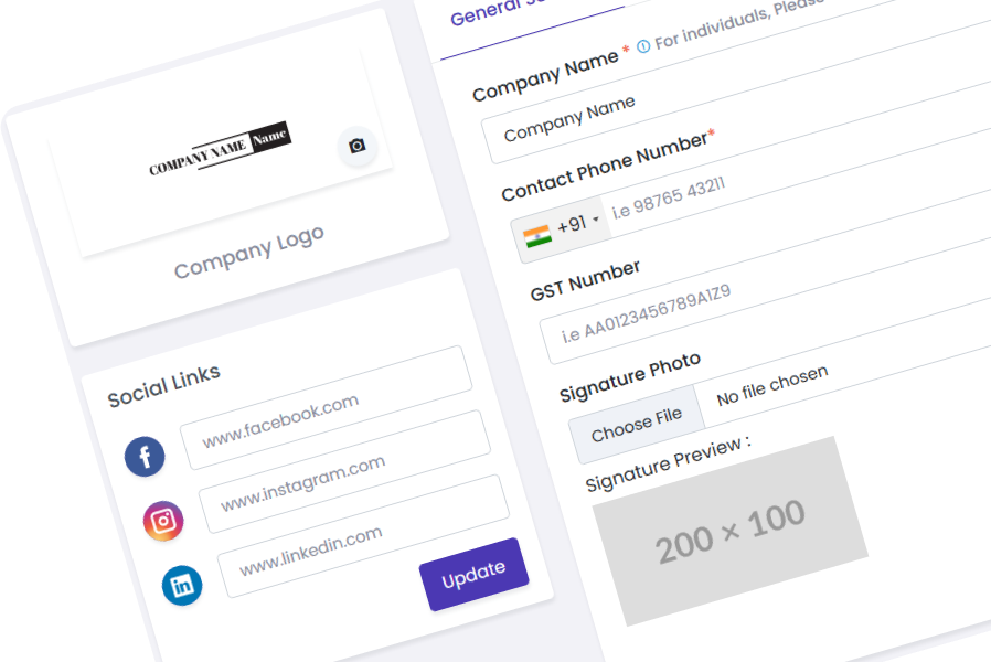Manage company details, banking information, GST numbers, and invoice patterns.