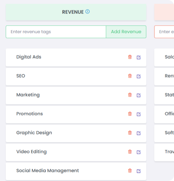 Create and manage categories and subcategories for revenue, expenses, and costs.